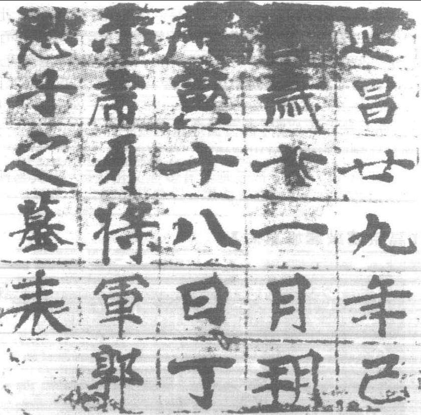 释义 | 高昌國墓磚民國元年 (1912),日本大谷探查隊于亞細亞中央吐魯番盆地哈拉和卓一帶,發掘古墓一群,有墓磚數十萬,其中磚 (A)製于延昌四年即南朝陳天嘉五年 (564),約三十公分見方。有楷行書六行,行六字; 磚 (B) 製于延和九年(即隋大業六年一610),約三十公分見方。有楷行書五行。行七、八字; 磚(C)製于延昌二十九年 (589),有楷書五行,行五、六字。俱係墨書,屬率意之筆,書法高古,古樸敦厚,類似北魏造像記,然書性温和,乏寒險之氣。斯時墨迹不多,此墓磚誠為珍貴遺品。已流入日本,歸大谷大學所藏。 高昌國墓碑 (C) |