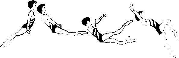 释义 | 高杠支撑后倒成低杠单挂膝悬垂 高杠支撑后倒成低杠单挂膝悬垂由高杠到低杠简单过渡动作之一。即高杠支撑后倒同时稍收腹分腿,接着一腿屈膝挂低杠成悬垂。动作要领:高杠支撑,直臂压杠后倒肩,借向前惯性稍收腹并上下分腿,当身体下沉之时,上面腿顺势屈膝挂低杠成悬垂。教学重点:后倒时强调梗头、直臂压杠后倒肩。保护与帮助:保护者站高杠下侧立,一手托臀, 一手托腿助其成低杠挂膝。 高杠支撑后倒成低杠单挂膝 ☚ 蹬低杠成高杠翻身上 骑撑后倒挂膝上换握高杠 ☛ |