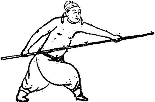 传统棍术动作。明程宗猷《少林棍法阐宗》载:“勾挂硬靠势,前拦搪势打圈里,勾挂硬靠走圈外。”
