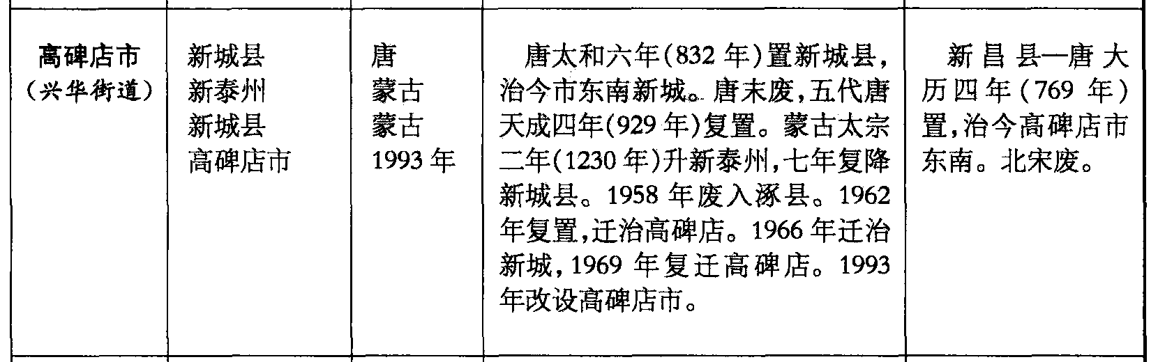 高碑店市(兴华街道)新城县新泰州新城县高碑店市唐蒙古蒙古1993年唐太和六年(832年)置新城县,治今市东南新城。唐末废,五代唐天成四年(929年)复置。蒙古太宗二年(1230年)升新泰州,七年复降新城县。1958年废入涿县。1962年复置,迁治高碑店。1966年迁治新城,1969年复迁高碑店。1993年改设高碑店市。新昌县—唐大历四年(769年)置,治今高碑店市东南。北宋废。