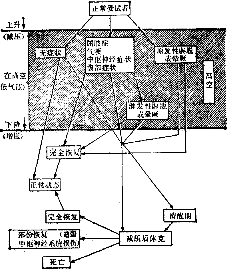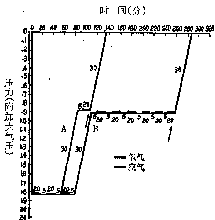 (6) 下降后的处置:症状已完全消失者,应警惕复发甚至发生减压后休克,因此除仅有轻度屈肢症的患者外,都应卧床休息,至少观察6~12小时。症状尚未完全消失者,应作对症治疗,吸入纯氧,或送入高压舱治疗。发生休克时,按休克患者处理. 对处于昏迷状态的患者,要注意预防脑水肿。 (7) 加压治疗:其适应症为: ❶空中发病,下降地面后仍未恢复者。 ❷曾在空中发病,下到地面后一度恢复,但不久又复发,特别是发生减压后休克者。 ❸空中未发病,下降地面发病者。其方法原则是: 高压舱内气体压力增到2~6个绝对大气压(一般情况下为3个绝对大气压),停留一段时间,待症状消失后,做阶段减压。治疗过程中,可间歇地吸用纯氧,以加速排氮和改善组织供氧情况。图3列出的是美国空军所使用的加压治疗方案,效果较好;但对有神经系统症状的患者,有时疗效不够理想,不能消除后遗症状。 图3 加压治疗方案(仿Davis等,1977,改作) 适应症: 方案A—屈肢症; 方案B—神经系统症状、气哽、血管运动不稳定、用方案A治疗10分钟仍无效的屈肢症↑—舱内观察者开始用氧的时间; 在方案B中,若治疗时间需要延长,则应从该停留站开始减压前30分钟起用氧 ☚ 高空胃肠胀气 体液沸腾 ☛ |