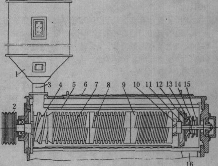 释义 | 高粱加工机械sorghum processing machinery将高粱加工成不同等级成品高粱米的成套机械。按加工工艺可分为: 高粱清理和分粒设备;高粱碾米和成品整理设备;下脚料和副产品(米糠、碎米)处理设备等(图1)。 图1 中型高粱米厂工艺流程图 1. 振动筛; 2. 立式砂臼碾米机; 3. 吸风分离器;4. 比重去石机; 5. 双辊碾米机; 6. 立式刷米机; 7.成品分级筛; 8. 卸料器; 9. 吸铁装置; 10. 糠粞分离筛 高粱清理和分粒设备主要有溜筛、简易振动筛、自衡振动筛、吸风分离器、比重去石机和磁选装置。 高粱碾米因高粱皮层粘厚,并含有单宁,去皮比较困难,通常采用多道碾削型碾米机碾白。除采用横式三节砂辊碾米机、双辊碾米机和立式砂臼碾米机外,还可用二节砂辊碾米机、立式三节砂辊碾米机和立式凸形砂臼碾米机等。20世纪80年代研制成一种适应于杂交高粱和粉质高粱的新型高粱碾米机即螺旋米机(图2),高粱在由螺旋推进器、三节螺旋砂辊、米筛和米刀等部分组成的碾白室内,主要依靠碾削和擦离作用去皮。属于混合型碾米机。每节砂辊直径×长度为φ215×289毫米,全部采用螺旋砂辊,碾白效率较高,去皮均匀,破碎率低,出米率高,并可减少碾米道数。已被推广使用。 碾制后的高粱米,经筛选或风选设备分出米糠,但由于高粱米糠粘度较大,仍会有部分米糠粘附在米粒表面,需借助刷米机除去。高粱刷米机有立式和卧式之分。通常采用立式刷米机,卧式刷米机需要动力较大,一般用于分离高粱米中的米糠和碎米。 下脚料和副产品处理设备有吸风分离器、振动筛和圆筛等,也有用溜筛分离出整米和大碎米。 图2 螺旋米机结构示意图 1. 进料斗; 2. 三角胶带轮; 3. 进料插门; 4. 螺旋推进器; 5. 米刀; 6. 米筛; 7. 头段螺旋砂辊;8. 中段螺旋砂辊; 9. 尾段螺旋砂辊; 10. 拨米刮板;11. 出料口; 12. 弹簧压力门; 13. 弹簧; 14. 调压手轮; 15. 紧固螺母; 16. 出米口 |