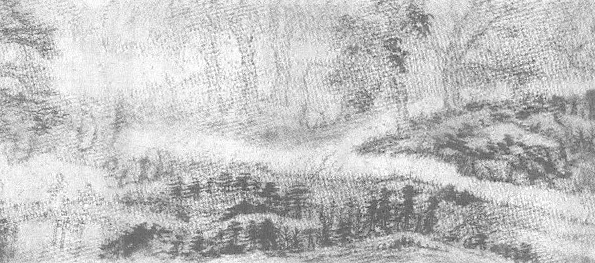 清。髡残(见《髡残苍翠凌天图轴》条目)绘。纸本设色。纵28.1厘米,横248.3厘米。上海博物馆藏。此为一幅横景式画卷。作者将一段山野的景色一路绘来。图中峰峦连绵俊逸,林木繁茂蓊茸,石阶随山势而行,河水逶迤平缓。红墙绿瓦的寺院掩映在赭石翠树间。古塔为松柏环绕。依水而建的木亭富有特色,一半水中一半岸上。图中有两处人物活动场景。拱形木桥横跨水面,一红衣老者握杖行于桥上,一童子腋下携琴尾随而来。图卷的末尾处绘一泓水湾,一叶扁舟漂浮于水面,渔翁坐在船头垂钓。在这幽深秀美的环境中,人物透出幽雅含蓄、超凡脱俗的气质。整个画卷构图疏密得当,景物层次有序。作者笔格遒劲,干湿并用,意境高妙,浅绛的设色和深浅不同的墨色丰富了画面的层次。图后有自题五言诗一首,款署“浙江学人”。诗起首钤〈浙江〉朱文印,后钤〈释弘仁印〉白文印。