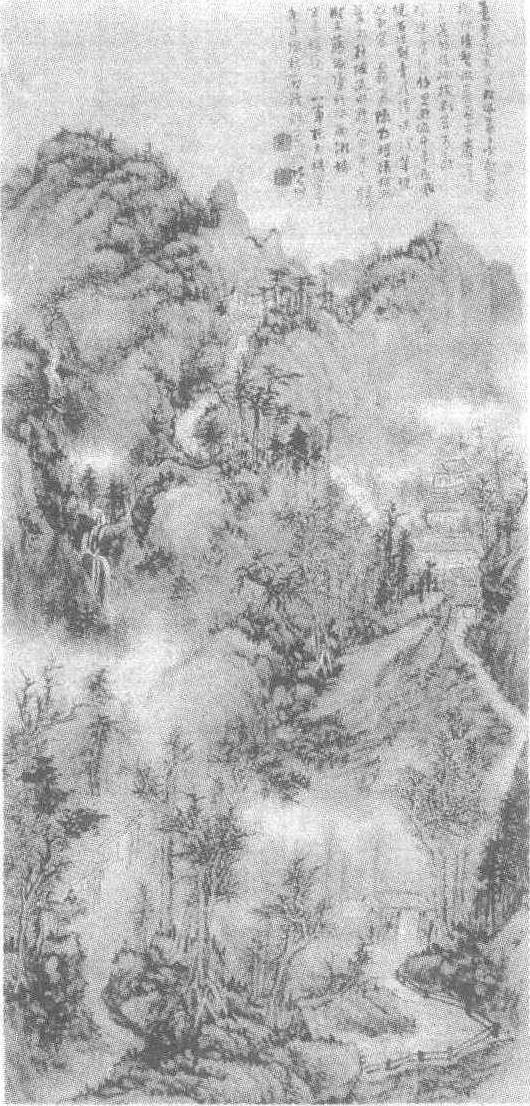 清。髡残绘。纸本设色。纵85厘米,横40.1厘米。江苏省南京博物院藏。髡残(公元1612—1673年),僧,字石溪,号白秃,又号残道者,武陵(今湖南常德)人。年轻时曾参加抗清斗争,失败后愤而为僧,居南京牛首祖堂山幽栖寺多年,对禅学修养甚深,与顾炎武友好。擅画山水,受巨然、元四家、沈周等影响较大,善用秃笔和渴笔,以书法入画,笔墨苍茫,境界奇辟,峰峦浑厚,自成风格。与程正揆(青溪)在画史上并称“二溪”,与八大山人、弘仁、石涛被后人并称为清初四大画僧。此图绘崇山峻岭,断崖绝壁,草木蓊葺,霜叶如花,溪水曲折奔腾,石径依山而绕。红墙的庙宇在山野间分外醒目。山麓有木栅相围的小院,房舍为秋树环抱,屋内一人凭几观景,恬然自得。整个画面构图层次分明,远处烟嶂隐约可见,给人以纵深感。近处的小院和观景人清晰准确,令人有如临其境之感。作者以干墨皴擦,焦墨点苔,用笔苍莽荒率,气势雄浑。设色以浅绛为主,使秋季深山的景色特征显著。画面上端有自题五言诗一首:“苍翠凌天半,松风晨夕吹,飞泉悬树杪,清馨彻山陲,屋居摩崖立,花明倚磵披,剥苔看断碣,追旧起余思,游迹千年在,风规百世期,幸从清课后,笔砚亦相宜。雾气隐朝晖,疏村入翠微,路随流水转,入自半天归,树古藤偏坠,秋深雨渐稀,坐来诸境了,心事托天机。”款署“石溪残道人”,钤白文篆书〈石溪〉〈电住道人〉印,所署“庚子”,指顺治十七年(公元1660年)。