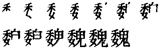 【提示】委,位于字左时,其中的捺笔改点; 禾,中间是竖,不是竖钩; 女,位于字或部件的左边或左下时,末笔的横与撇相接,撇、横均不出头。鬼,9画,中间竖撇由白中撇出; 旧字形10画,中间一撇断为一竖、一撇两笔。 *魏wèi17画 鬼部 (1) 西周国名。 (2) 战国时代七雄之一。在今河南北部、陕西东部、山西南部和河北南部一带。 (3) 三国之一。公元220—265年,曹丕所建。 (4) 南北朝时北朝之一,史称北魏,后分裂为东魏和西魏。 魏wèi小篆和汉隶作巍。从嵬(wéi,周代假借为国名。从山,鬼声),委声。义同嵬。山高大义。约汉代以后,省去山字头。三国时又假借为国名。高大义转为名词,指阙(què)宫门的台观,也叫象魏。南北朝时北朝之一又叫魏,后称北魏。 魏★常◎常wèi形声,从鬼,委声,鬼指隐秘莫测,本义为帝王居住的幽深的宫阙,假借为古国名(旧地在今河南)、姓等。 【辨析】 以“魏”作音符构成的形声字一般读wēi:巍。 |