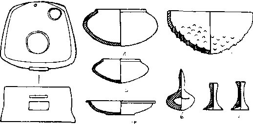 (1.陶灶 2.陶水斗 3.陶盘 4、5陶釜 6.陶甑7.筒豆 8.五铁 9.琉璃耳珰) 魏家楼子汉墓出土器物