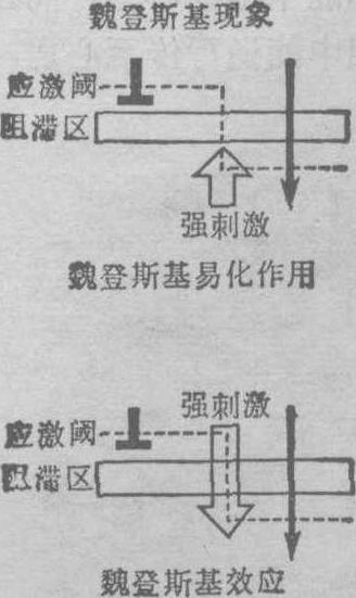 魏登斯基现象(Wedensky phenomenon)分为魏登斯基易化作用 (Wedensky facilitation)和魏登斯基效应(Wedensky effect)两类。魏登斯基易化作用是原来处于抑制状态的传导组织,在接受一次强刺激后,使原来受阻的向下冲动得以通过。魏登斯基效应是指一次强刺激突破阻滞区下传后,随后而来的同侧阈下冲动能通过该阻滞区(图1)。