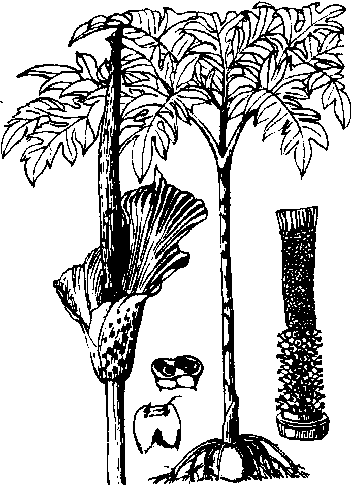 释义 | ![]() ![]() ![]() 根茎类蔬菜 根茎类蔬菜萝卜:菲 葖(葖子;雹葖) 芦菔 莱菔萝卜 土酥 地酥 温菘 拉萝 雹突 辣玉 紫花菘 ☚ 常见蔬菜 荤菜 ☛ 魔芋elephant-foot yam;elephant taro天南星科(Araceae)魔芋属中的栽培种群,多年生草本,属名Amor phophallus Blume ex Decne.,别名蒟蒻。球茎含葡甘露糖高达40~65%(该糖是由两份甘露糖和一份葡萄糖组成的高分子化合物),膨胀率高,粘着力强。魔芋块茎富含淀粉,有毒,须经石灰水漂煮后才可食用或酿酒,常用以制魔芋豆腐。还有降血脂、血清胆固醇及消肿攻毒的作用,也是重要的添加剂和化工原料。 魔 芋 种类 魔芋属约有100个种,中国有6个可供食用的栽培种,即花魔芋(A.rivieri Durieu.)、白魔芋(A.albus Liu et Chen)、滇魔芋(A. yunnanensis Engl.)、东川魔芋(A.mairei Levl.)、疏毛魔芋(A.sinensis Bel-ral.)及疣柄魔芋(A.virosus N.E.Brown)。其中花魔芋多分布在海拔800~2 500米或更高的地区,栽培较普遍,单芋重0.5公斤以上,大者达1~3公斤,产量较高,但品质较差; 白魔芋多分布在海拔800米以下地区,以四川和湖南两省栽培为主,单芋重0.5公斤以下,产量较低。但品质好,商品性高。 生长发育与球茎形成 魔芋的生长发育过程可分为幼苗期、换头期、球茎膨大期及球茎成熟期。 幼苗期 当日均温在15℃以上时,魔芋顶芽开始萌动,向上形成叶片,向下分化成原形成层,进行初生生长,形成球茎,同时分生组织区发生不定根。 换头期 新球茎形成后,继续利用母体营养使子体根、茎、叶生长,最后母体营养耗尽而干缩,脱离子体,完成“换头”。子体,在栽种后90~120天内完成由依赖母体营养到自体营养的转变。 球茎膨大期 子球茎换头后,球茎迅速膨大,约持续45天。此期形成球茎重量的80%。根状茎同时迅速膨大。 球茎成熟期 8月底以后,球茎增重速度减小,趋向成熟。 4~5年生植株,秋季形成花芽,翌春开花。通常营养植株只长叶,开花植株只抽生花序,整个生殖生长完全依靠球茎中的营养物质,除留种植株外,发现花芽立即去除。 魔芋喜温暖,忌高温。在年平均温度14~20℃、无霜期240天以上的地区都能种植。18~20℃时,地上部生长旺盛;20~26℃时,最适根系发育;22~30℃时,球茎膨大迅速。生长期中能耐短期35℃高温,15℃以下时停止生长,地上部倒伏。球茎不耐0℃以下低温。白魔芋从发芽到收获,需有效积温1 658℃;花魔芋需有效积温1 089℃。魔芋为半阴性植物,光饱和点为17 000~22 000勒克斯;光补偿点为2 000勒克斯。长时间强光照,则光合效率下降,叶片萎蔫,易感染病害。大面积种植时宜与玉米等高秆作物间作。 魔芋生长前期和块茎膨大期需要较湿润的土壤环境,一般以田间持水量的80%为宜。湿度过大,土壤透气性降低,不利球茎膨大。生长后期要适当控制水分,土壤湿度由80%降到60%,以提高耐贮性。在土层深厚、质地疏松、排水良好、富含有机质的砂壤上中栽培,有利于根系发展和球茎膨大。酸性土壤可适当施用石灰。 栽培技术 魔芋可用“种子”、根状茎、整芋或切块作播种材料。“种子”(即果实中的小球茎)需在阴凉处或用砂层积贮存。根状茎过大时可切断作种。整芋需选1~2年生、无病、0.1~0.5公斤重、圆形或长圆形的球茎作种。扁圆且顶芽较深的,因茎龄过长不宜作种。切块是指将冬贮个体大的球茎,以顶芽为中心纵向切开,使每块约重0.5公斤:或在贮藏前去掉顶芽,促发侧芽,栽植前带一芽切块作播种材料。 魔芋宜选土层深、肥沃、能排灌的地栽培。栽植前及时整地。施肥以钾最多、氮次之、磷最少的原则,每亩(计划产量2 500公斤)施氮25公斤、磷20公斤、钾30公斤,其中50%作基肥,余作追肥。于幼苗期(5月下旬)及换头期(6月下旬)施用。 每年春季当日均温稳定在15℃以上时进行栽植。一般行距为种芋横径的6倍,株距为4倍;栽植深度以块茎上部离地面5~6厘米为宜。栽植时芽向上倾斜,以免积水引起烂种。为防止或减少干旱引起土壤板结、地温上升和病害发生,于栽植后用干草或麦秆等覆盖地面。 秋季当气温降到15℃以下时,块茎停止膨大。四川一般在10月下旬完全倒苗后采收。 魔芋的病害主要有白绢病(见辣椒)和软腐病(见大白菜)。 魔芋giant arumAmorphophallus rivieri,天南星科魔芋属多年生球茎植物。染色体基数x=13。球状块茎粗大,直径可达30cm。先花后叶,花葶高达100cm,佛焰苞大,长约30cm,深紫色,有光泽,基部呈筒状;肉穗花序内藏或突出, 端有长达 20~30cm的附属体,黑堇色,花单性,上部为雄花,下部为雌花,初开时有奇臭。花后出一叶,具3小叶,小叶二岐分杈,裂片再羽状深裂,小裂片椭圆形至卵状长圆形,基部楔形,一侧下延于羽轴成狭翅。原产越南,中国西南多栽培。喜温暖、湿润,深厚肥沃土壤。冬季球茎休眠,置于干燥、温暖处越冬。春季上盆后可不浇水,至开花。出叶后照常管理。叶大,奇特,可盆栽观赏。温暖地区可大田栽培,收获球状块茎。因富含淀粉,可供食用、药用或作工业原料。 魔芋elephantfoot yam,elephant taro又称蒻。天南星科,魔芋属 (AmorphophallusBlume ex Decne.),多年生草本。原产东印度及斯里兰卡热带森林。热带、亚热带国家已普遍栽培。中国长江中游地区栽培较多。根肉质,上有弦状不定根。成熟球茎上部为短缩茎,下部是贮藏组织,为圆球或扁球形。二年生球茎生的根状茎每节有芽,是最佳的繁殖材料。每年只生一片大型掌状复叶,小叶呈羽状分裂,深绿色。花单生,淡黄色,肉穗花序,开花时有