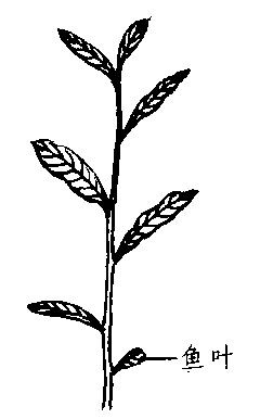 鱼叶三3524名鱼鳞。吴语。江苏丹阳。   鱼叶fish leaf又称胎叶。茶树新梢萌发过程中,先长鳞片,后开展的头一片叶。状似鱼类胸鳍,故名。一般每一新梢只有1片鱼叶,也有2~3片或缺如。颜色较芽叶稍淡,厚而脆;叶柄宽而扁平,侧脉隐而不显;叶缘仅前端具锯齿或不明显;叶尖圆钝。性状在真叶和鳞片之间。鱼叶发育不全,不采摘,否则制成的毛茶品质次下。