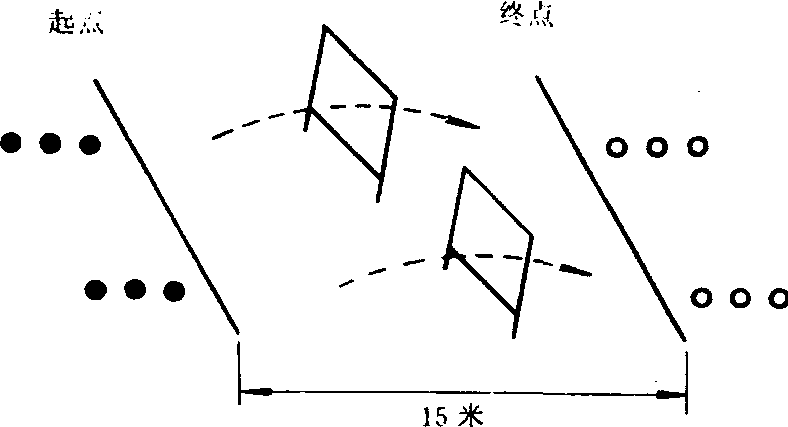 场地 在操场空地画两条相距15米的平行线, 一条为起点,另一条为终点。在两条平行线之间插两根竹杆,竹杆中间系两根皮筋,皮筋上下间隔1米,接近地面的1根皮筋离地60—80厘米,形成“窗”,“窗”前放垫子若干块。