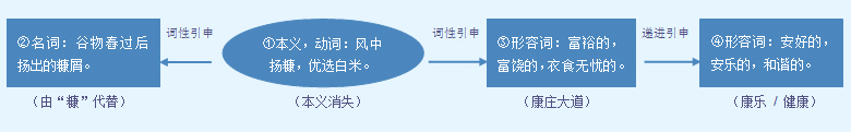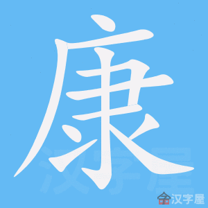 字源解说 “康”是“糠”的本字。康,甲骨文 = (倒写的人,“屰”)+ (倒写的“其”,簸箕)+ (屑末),表示逆风扬箕,扬去糙米中的屑末糠粉。有的甲骨文 误将倒写的“人” (屰)写成“干” ,误将“其”形的 写成双手 。金文 、 承续甲骨文字形。篆文 将金文字形 中的糠粉状 写成“米” ,表示扬糠选米。造字本义:风中扬糠,优选白米。隶书 将篆文字形中的双手状 写成“尹” 。当“康”的“扬糠”本义消失后,再加“米”另造“糠”代替。中医方面,称体形挺拔强壮为“健”* ,强调躯干外形的结实;称体内滋润和谐为“康”,强调代谢状态的安适自在。附 文言版《说文解字》:穅,穀皮也。从禾,从米,庚聲。 ,穅或省。 附 白话版《说文解字》:穅,是谷物的皮壳。字形采用“禾、米”作边旁,采用“庚”作声旁。 ,这是“穅”的异体字,省去了“禾”。 引申线索