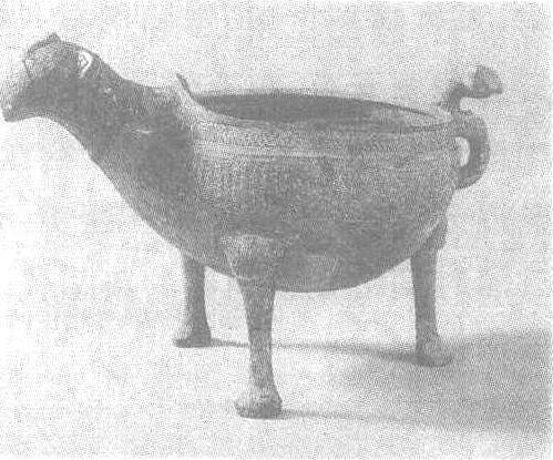 战国。通高15.7厘米,通长22.9厘米,口径11.9厘米,宽15.3厘米,壁厚0.1厘米。1951年河北省唐山贾各庄出土。北京中国历史博物馆藏。此铜匜鼎作鼎身流如匜形。圜底。流向前突出作鸟首形,颈上有一周几何形绳索纹及羽毛纹。两耳突出,凸睛尖喙,倾水时上喙可以开启。腹上有一圈变形绳索纹及羽毛纹。腹内铸有两个鸭形纹,鸭头与流同一方向,张翼伸展,非常生动。鋬的上端也作鸟首形。腹下有三兽蹄形长足,上端饰饕餮纹。器身铸范的接合痕迹不清楚。流、鋬、足等附件皆为事先铸成,然后合铸于器身之上。出土时流内犹存铸范的粘土,可见此器铸好后未曾使用。此器鋬作回首鸟首形,是比较特殊的,因为在其他的器物中,通常是作兽首形。