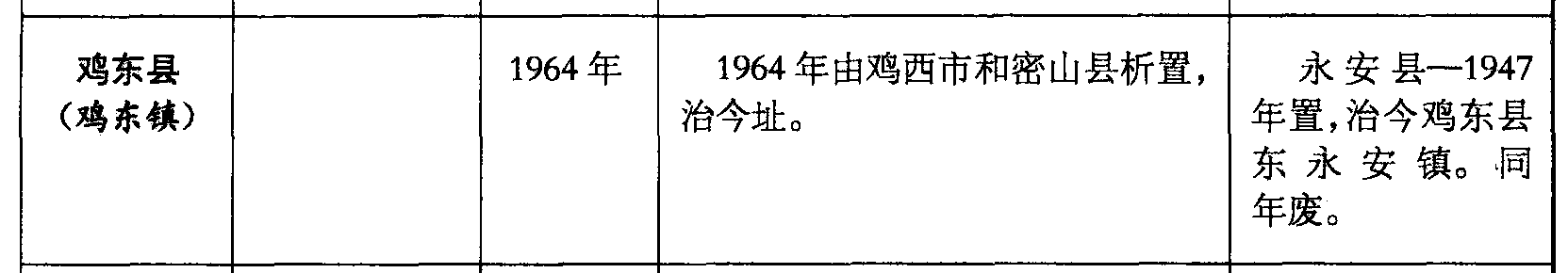 鸡东县(鸡东镇)1964年1964年由鸡西市和密山县析置,治今址。永安县—1947年置,治今鸡东县东永安镇。同年废。