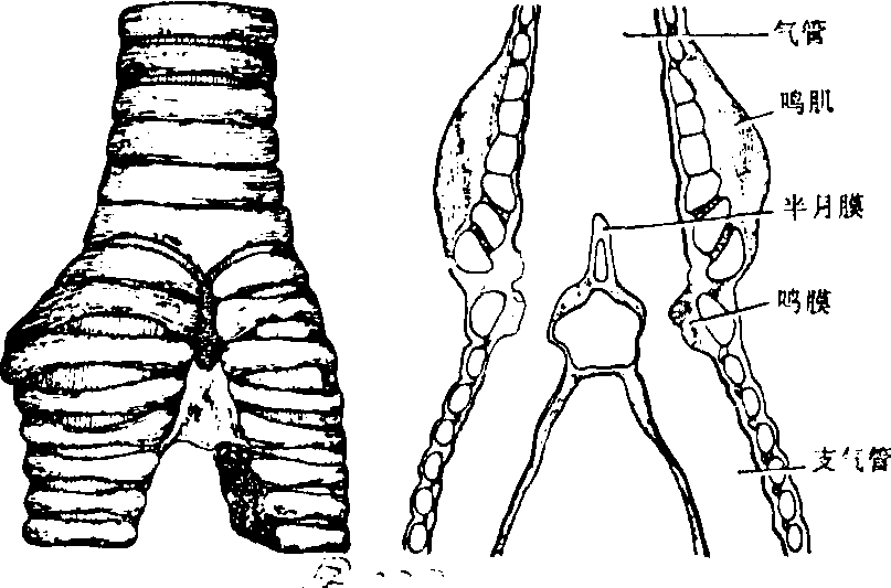 图223 鸟类的鸣管 ☚ 叉骨 栖肌 ☛ 鸣管 鸣管鸟类的一种特殊发音器官。鸣管位于气管与支气管交界处。由多个扩大的软骨环及其间的鸣膜组成。肺内空气通过气管冲出时,使鸣膜等鼓动而发声。某些鸟类在气管的两侧,附有特殊的鸣肌,可以调节鸣膜的紧张度,能改变鸣声的长短、高低。如鸣禽类有4~5对鸣肌,故鸣声洪亮,婉转悦耳,常被饲养在笼内观赏。鹑鸡虽有完整的鸣管,但缺少鸣肌,不能调节鸣声。有些鸟的鸣管极为简单,鸣声单调,如驼鸟。 ☚ 嘴 雏鸟 ☛ 00003051 |