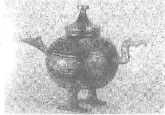 战国时期陶器,1974~1978年河北省平山县三汲公社战国中山王墓出土。通高二十七点八厘米,长三十厘米。器形模仿野鸭的形象,上有高顶圆钮盖,小口、直唇,球形腹,平底,一对短腿蹼足,前有鸭头为流,后有鸭尾为扳手。器表经磨光并缀以压划花纹为装饰,古朴典雅,造型极佳,设计构思巧妙,是一件难得的精致艺术佳品。黑陶,即黑色陶器,是在强还原气氛中进行渗碳烧制的,和以氧化气氛烧制的红陶,及以弱还原气氛烧制的灰陶相比,标志着陶器烧成技术的更加进步。黑陶采用轮制法制成,器型规整,胎体薄厚匀称,器表乌黑光亮。黑陶工艺在造型上最具特色,器形以盆、豆、杯、翚、罐等最为常见。在新石器时代的大汶口文化、龙山文化、屈家岭文化和良渚文化等遗址中时有发现。现藏于河北省博物馆。