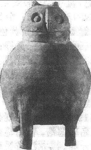 汉代,1975年大连市新金县花儿山贝墓出土。通高29.5、腹径16.87厘米,泥质灰陶,通体为鸱鸮(猫头鹰)造型。子母口,半球形盖,壶盖即猫头鹰的头部、短嘴,嘴两边有一对对称的大眼睛,盖顶有一对小竖耳、短颈、鼓腹、正面腹下部有一对圆柱形鹰足,背面底部外撇,作鹰尾形。陶壶在造型上抓住了猫头鹰的主要特点,将一个竖着耳朵,瞪大了双眼,随时准备出击捕食的猫头鹰的形象,塑造地准确生动,维妙维肖,为已出土的西汉陶鸱鸮壶中较好的一件,现藏旅顺博物馆。