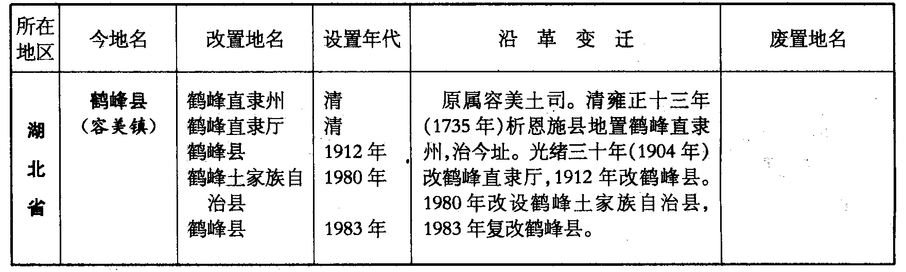 鹤峰县(容美镇)鹤峰直隶州鹤峰直隶厅鹤峰县鹤峰土家族自治县鹤峰县清清1912年1980年1983年原属容美土司。清雍正十三年(1735年)析恩施县地置鹤峰直隶州,治今址。光绪三十年(1904年)改鹤峰直隶厅,1912年改鹤峰县。1980年改设鹤峰土家族自治县,1983年复改鹤峰县。