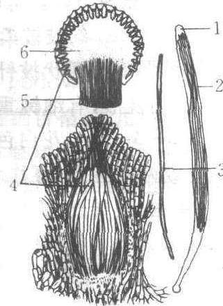 麦角菌属 1. 子囊顶壁 2. 子囊 3. 子囊孢子 4. 子座柄 5.子座 6. 子囊壳 |