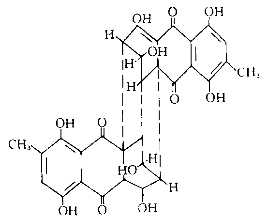 释义 | 黄天精luteoskyrin岛青霉(Penicillium islandicum)的代谢产物之一。为黄色六面体针状结晶,熔点为287℃,分子质量547 u,其结构式如右。该菌污染的大米会变黄并含有这种毒素。此毒素为害肝脏,实验动物出现肝炎、肝硬变及肝癌。 |