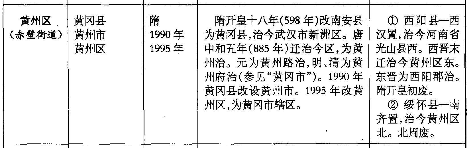 黄州区(赤壁街道)黄冈县黄州市黄州区隋1990年1995年隋开皇十八年(598年)改南安县为黄冈县,治今武汉市新洲区。唐中和五年(885年)迁治今区,为黄州治。元为黄州路治,明、清为黄州府治(参见“黄冈市”)。1990年黄冈县改设黄州市。1995年改黄州区,为黄冈市辖区。❶ 西阳县—西汉置,治今河南省光山县西。西晋末迁治今黄州区东。东晋为西阳郡治。隋开皇初废。❷ 绥怀县—南齐置,治今黄州区北。北周废。