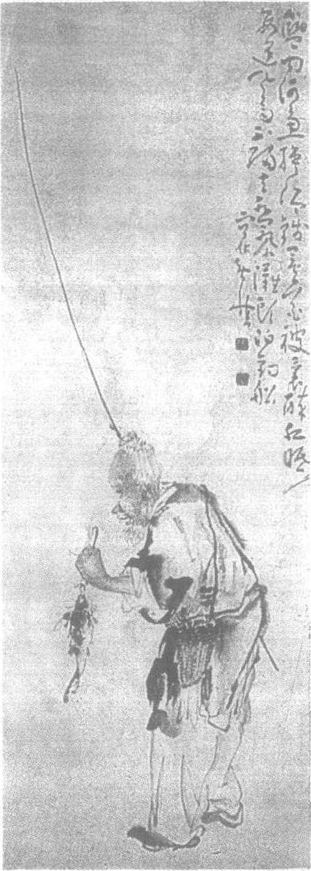 纸本,设色。现藏北京故宫博物院。描写一老渔夫,一手举钓竿,一手提鱼,面部显出高兴的神态。用笔粗放,衣褶连勾带染,画面自题: “篮内河鱼换酒钱,芦花被里醉孤眠,每逢风雨不归去,红寥滩头泊钓船。宁化黄慎。” 草书题款,古拙而潇洒。人物也带有明显的书法意味。这是前所未见的。