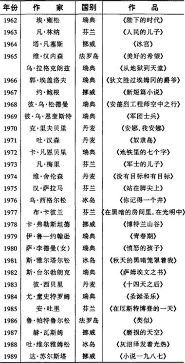 北欧最重要的文学奖,由北欧理事会倡议于1962年由北欧各国政府共同设立,用以表彰北欧作家用北欧语言写作的优秀文学作品。 作品可包括长篇小说、剧本、诗集、短篇小说集、论文集以及具有高文学和艺术水平的文学作品。每年授奖一次,授给一位或两位作家。授奖作品的评选范围是丹麦语、挪威语和瑞典语两年之内发表的作品,芬兰语、冰岛语、法罗语和拉普语4年之内发表的作品。 从1977年起奖金为7万5千丹麦克朗。 自1962年北欧理事会文学奖设立至1989年共有10位瑞典作家、5位芬兰作家、5位挪威作家、4位丹麦作家、3位冰岛作家和2位法罗岛作家获奖。 附:北欧理事会文学奖获得者 (1962-1989)  |
