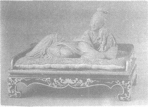 清前期。通高10厘米,仕女高6.3厘米。北京故宫博物院藏。仕女头挽高髻,左手托颊,曲肱倚书囊,右臂垂搭囊角,支右腿,半卧在束腰黑漆描金罗汉床上,宽袖长袍及披肩随体势自然顺下。樱桃小口微启,合目小憩。体态十分优美。此木雕刀法圆熟,刻划细致入微。
