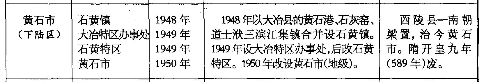 黄石市 黄石市石黄镇 大冶特区办事处 石黄特区 黄石市黄石市 (下陆区) 石黄镇 大冶特区办事处 石黄特区 黄石市 1948年 1949年 1949年 1950年 1948年以大冶县的黄石港、石灰窑、道士洑三滨江集镇合并设石黄镇。1949年设大冶特区办事处,后改石黄特区。1950年改设黄石市(地级)。 西陵县—南朝梁置,治今黄石市。隋开皇九年(589年)废。