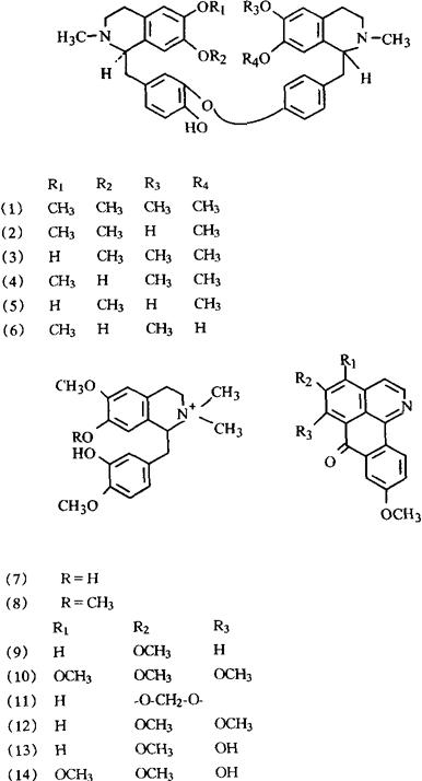 释义 | 北豆根 【名称出处】:《中药志》 【概况】: 异名 蝙蝠藤(《纲目拾遗》),山豆根(药材名),北豆根(《中国药典》)。 基源 为防已科蝙蝠葛属植物蝙蝠葛的根茎。蝙蝠葛属全世界约2种;中国仅1种,供药用。 原植物 蝙蝠葛Menispermum dauricum DC.,又名山豆秧根、苦豆根(内蒙古),蝙蝠藤(浙江)。 历史 蝙蝠藤始见于《纲目拾遗》,载:“此藤附生岩壁、乔木。及人墙茨侧,叶类蒲萄而小,多岐,劲厚青滑,绝以蝙蝠形、故名”。北豆根一名始见于《中国药典》,有“北方用的山豆根”之意,而与南方所产的山豆根现名广豆根相区别。近年来药厂从中提取生物碱制成片剂及针剂应用。 形态 多年来生缠绕性草本。 长达10m以上,全体近无毛。根状茎多横生,细长。茎基部梢木质,小枝绿色,有纵条纹。叶互生;叶柄盾状著生,长6~12cm,被稀短毛;叶片圆肾形或卵圆形,长宽均约5~15cm,先端尖,基部心形或截形,叶缘近全缘或5~7浅裂,裂片近三角形,叶面绿色,背面苍白色,具掌状脉5~7条。 花序腋生,短圆锥状,花小,单性异株;雄花序总花梗长3~7cm,花梗长5~7mm,基部具小苞片1,线状披针形,雄花萼片6,窄倒卵形,花瓣卵圆形,较花萼小;雄蕊10~20,花药球形;雌花通常具3心皮,分离、花柱短。核果球形,熟时黑紫色。种子1,马蹄形。 花期6~7月,果期7~8月。 (图见《中药志》第1册.第55页.第2版.图39) 生境与分布 生于山地灌丛中或攀援岩上。分布于华北、华东、东北、中南、陕西、四川、贵州。 药材北豆根主产于华北、东北及陕西。一般多自产自销。 。 【生药】: 采集 春秋两季采挖,除去茎叶、须根和泥土,晒干。 鉴别 性状 根茎长圆柱形,常弯曲,有时可见分枝,长约50cm,直径3~8mm;表面黄棕色至暗棕色,有纵皱纹及稀疏的细根或凸起的细根痕,外皮易成片脱落。质韧,不易折断,折断面不整齐,纤维性,维管束呈放射状排列,木质部淡黄色,中心有类白色的髓。气微,味苦。以条粗长、外皮色黄棕、断面色浅黄者为佳。 显微 根茎(直径约5mm)横切面:表皮细胞一列,外被厚的棕黄色角质层,表皮下方常有断续的木栓层产生,具明显皮孔。皮层细胞多列,有单个石细胞散在,石细胞呈分枝状、不规则形、类圆形或类方形。 中柱鞘纤维排列成新月形,两侧有石细胞群,石细胞类圆形或椭圆形。韧皮部均为薄壁性细胞。 束间形成层不明显。 木质部导管、管胞、木纤维及木薄壁细胞均木化;木薄壁细胞具纹孔,并常1~3列径向排在木质部束两侧。射线细胞宽5~13列,有石细胞散在。髓细胞具纹孔。 本品薄壁细胞中含细小淀粉粒及小草酸钙结晶。(图见《中药志》.第1册.第2版.图40) 粉末:灰棕色,气微,味苦。 ❶ 石细胞,常单个散在,淡黄色或鲜黄色,大多呈特异不规则分枝状,有2~7分枝,个别分枝又有短分枝,顶面观宛似数个细胞重叠,直径43~173μm,少数长至370μm,壁厚12~34μm,有的具1~3个横隔,分2~4小腔,内含棕色物或细小草酸钙砂晶;另有少数石细胞呈类圆形、类长方形或类三角形.直径26~87μm。 ❸ 草酸钙砂晶,主要存在于皮层细胞及射线细胞中,大多呈棒状或砂粒状,直径1~2μm,少数至9μm。 ❺ 木纤维常与导管毗连,纤维管胞末端尖,直径12~32μm,壁厚3~5μm,有具缘纹孔,纹孔口斜裂缝状,韧型纤维少数,具单斜纹孔或交叉成十字形。另可见导管、淀粉粒、表皮细胞及木栓细胞。 (图见《中药材粉末显微鉴定》.图103) 理化 取样品粉末2g,加氨试液1.5ml及苯15ml,振摇,过夜,滤过,滤液用0.5%硫酸16ml分4次提取,合并酸液,用浓氨水碱化,再以氯仿20ml分4次提取,合并氯仿液,加无水硫酸钠少许脱水,滤过,蒸去氯仿至约0.8ml,点于硅胶G板上,以氯仿甲醇-氨水(8:2:)1滴为展开剂,以山豆根为对照。展距18cm,用改良碘化铋钾试剂显色。(图见《中药材薄层色谱鉴别》.图47) 加工炮制 取原药材,除去杂质及残茎,大小个分开,浸泡至六七成透时,捞出,闷润至透,切薄片,干燥。。 【化学】: 含总生物碱约1%以上,其中以蝙蝠葛碱和蝙蝠葛任碱含量较多[1]。 从不同地区产的北豆根中,分离得到的双苄基四氢异喹啉生物碱:蝙蝠葛碱(Dauricine)(1)、蝙蝠葛诺林碱(Daurinoiline)(2)、蝙蝠葛新诺林碱(Dauricineoline)(3)、蝙蝠葛苏林碱(Daurisoline)(4)、蝙蝠葛可林碱(Dauricoline)(5)、蝙蝠葛新林碱(Dauriciline)(6)[2];阿朴啡季铵型碱:木兰碱(Magnoflorine)(7)、蝙蝠葛任碱(Menisperine)(8);氧化异阿朴啡生物碱:蝙蝠葛辛碱(Bianfugecine)(9)、蝙蝠葛宁碱(Bianfugenine)(10)、蝙蝠葛定碱(Bianfugedine)(11)、蝙蝠葛啡碱(Menisporphine)(12)、二氢蝙蝠葛啡碱(2,3-Dihydro-menisporphine)、去甲蝙蝠葛啡碱(6-ODemethylmenisporphine)(13)、蝙蝠葛啡诺林碱(Dauriporphinoline)(14)[3]。 此外,还有青藤碱(Sinomenine)、青藤防己碱(Acutumie)、N-去甲青藤防己碱(Acutumidine)、光叶千金藤碱(Stepharine)、碎米蕨叶碱(Cheilanthifoline)、光叶千金藤定碱(Stepholine)等。 附 叶中含青藤碱、双青藤碱(Disinomenine)、千金藤碱(Stephanine)、青藤防己碱及青藤防己次碱(Acutuminine)等。 参考文献 [1] 中草药学.中册.江苏人民出版社,1986:289 [2] 药学学报 1991;26(5):387 [3] 中国药科大学学报 1990;21(6):377。 【药理】: ❶ 抗心律失常作用 在猫乳头肌观察蝙蝠葛碱对心肌收缩性、自律性、不应期和兴奋性的影响,发现蝙蝠葛碱32μmol/L明显抑制其收缩力.15~20min时作用达高峰,收缩幅度降至给药前的72±6%。 用肾上腺素诱发乳头肌自律性,给予蝙蝠葛碱32μmol/L后诱发自律性的肾上腺素阈浓度可提高4.6±3.1倍。蝙蝠碱对乳