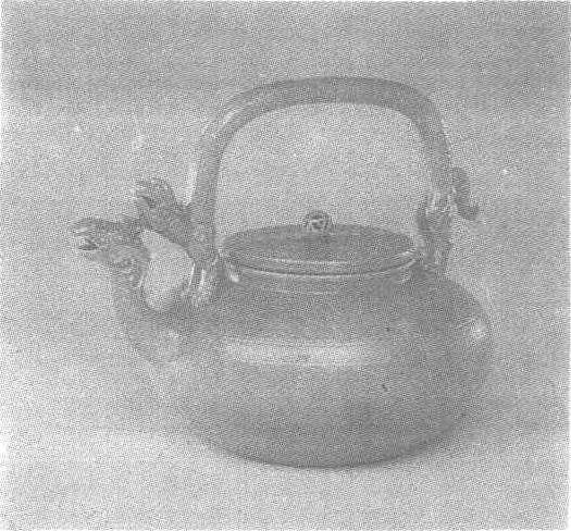 清康熙。高13.3厘米。北京故宫博物院藏。康熙时期壶的种类较多,有竹节式、提梁式、桃形倒流式,还有的做成福、禄、寿字形。此壶为众多形制中的一种,仿青铜壶而做。春秋和战国时期有类似的原始瓷壶。腹扁圆,壶流作凤头形,提梁做成身体弯曲高耸的龙形。壶身有夔龙暗花。造型和纹饰都具有一种古韵。通身施匀净的淡黄釉,极为素洁雅丽。