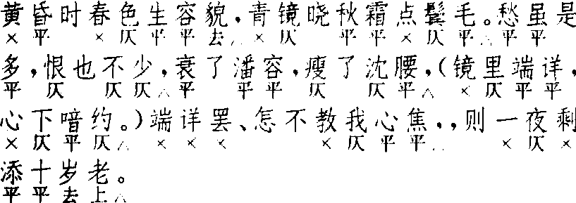 全曲首尾各七字二句,中间三字若干,增句在三字句后增四字句若干。首二句用〔隔尾〕,末二句用〔黄钟·尾声〕,故名〔黄钟尾〕。三字句多少不拘,最多者如宫大用《范张鸡黍》 三十八句,须双数,宜对偶,平仄不拘,隔句叶韵者多。增四字句以四句为度,须双数,宜对偶,平仄调协,隔句叶韵,此式用者较多。增句尚有他式:有在三字句前后增七字句者,如贾仲明《金安寿》三字句前增七字句九句,乔吉《扬州梦》三字句后增七字句八句,此盖受〔正宫·煞尾〕影响以致混同;有在末两句之间增句者,如关汉卿《不伏老》套增五字句四句,陈以仁《存孝打虎》增四字句四句不叶韵,贾仲明《裴度还带》(旧题关汉卿)三字句后增四字句四句及末两句之间增四字句四句均换叶他韵。此外尚有减句者,如高文秀《谇范叔》减末句前七字句一句。〔南吕〕套尾声题名不一致,但常用者不外〔隔尾〕、〔黄钟尾〕以及二者之增句格。〔黄钟尾〕亦入〔黄钟〕、〔正宫〕。