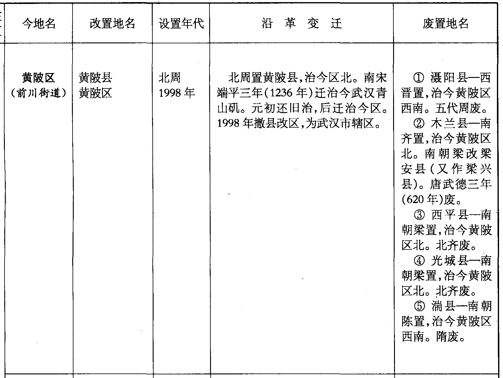 黄陂区(前川街道)黄陂县黄陂区北周1998年北周置黄陂县,治今区北。南宋端平三年(1236年)迁治今武汉青山矶。元初还旧治,后迁治今区。1998年撤县改区,为武汉市辖区。❶ 滠阳县—西晋置,治今黄陂区西南。五代周废。❷ 木兰县—南齐置,治今黄陂区北。南朝梁改梁安县(又作梁兴县)。唐武德三年(620年)废。❸ 西平县—南朝梁置,治今黄陂区北。北齐废。❹ 光城县—南朝梁置,治今黄陂区北。北齐废。❺ 湍县—南朝陈置,治今黄陂区西南。隋废。