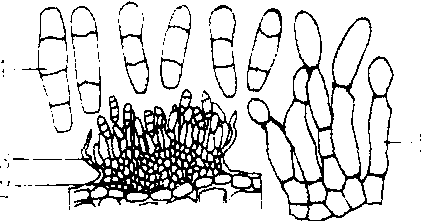 释义 | 黏隔孢属Septogloeum半知菌亚门,黑盘孢目。分生孢子盘呈盘形或垫状,灰白色至褐色,较小,散生或聚生在寄主表皮下。分生孢子梗短小,粗壮,单枝,平滑,无色,偶有1~2个隔膜,产孢细胞内壁芽生,瓶体式产孢;分生孢子圆柱形至倒棒形,2~4胞,直或稍弯,壁薄,平滑,无色,顶胞钝圆,基胞平截。常见的有大豆黏隔孢(S.sojae Yoshii et Nishiz.),引致大豆叶斑病;草莓黏隔孢(S.fragariae H⍥hn.),引致草莓叶斑病。 黏隔孢属 1.分生孢子梗 2.分生孢子盘 3.寄主表皮 4.分生孢子 |