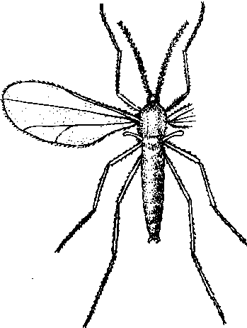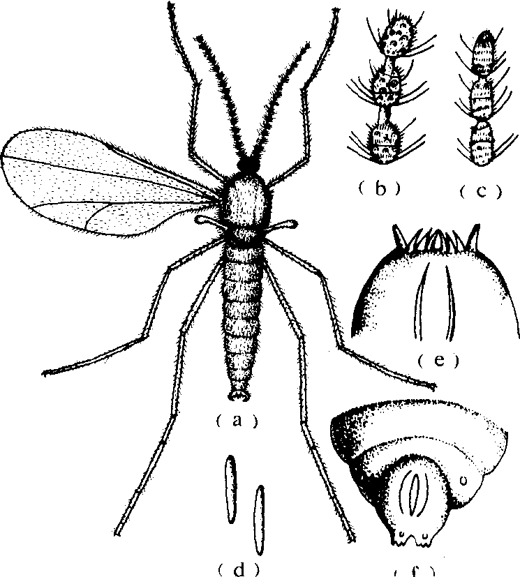 成虫体长3~4毫米,头、眼、胸均黑色。雌虫腹部红褐色,雄虫近黑色,末端粉红。触角黄褐,15~18节,有直立短毛,基部2节较其他节粗2倍。翅基粉红,第一径脉达翅前缘中部,径分脉较直,纵贯翅的全部,近翅尖处稍向下弯,于翅尖前与翅缘相接。第二肘脉与翅后缘相接,相接处与第一径脉末端相对。卵长圆柱形,长0.4~0.5毫米,初产时透明,有红色斑点,后变红褐。幼虫体长4毫米,初孵时红褐色,蜕皮后变乳白色或半透明,纺锤形,背中央有一半透明的绿色条纹,3龄幼虫前胸腹面后缘有一胸叉(见图)。围蛹栗褐色,长约4毫米,状似亚麻子,常隐藏在散落自生麦苗或早播麦苗基部茎秆与叶鞘间。在不同地区每年可发生1~5代,以末龄幼虫在围蛹内越冬。翌年春,小麦生长时,幼虫在围蛹内变为蛹,经1~2周羽化为成虫,不取食,天暖时在田间飞翔交配产卵,雌虫可产卵250~300粒,成虫寿命不超过4天。卵期3~12天,幼虫孵出后即沿叶脉沟爬行到叶鞘基部为害,不再爬动,直至小麦抽穗前形成围蛹。幼虫在麦茬的围蛹内越夏,随后化蛹,7月中旬羽化出成虫,在散落自生麦苗上完成夏季代。主要以围蛹随寄主植物茎秆(麦秆、垫草等)运输而远距离传播。主要防治措施是加强植物检疫,防止传播; 选育和引进抗虫品种; 收获后将麦茬及时深翻入土,消灭围蛹和自生麦苗; 适当推迟播种期,避开成虫产卵; 用甲拌磷乳油拌种。 黑森瘿蚊Hessian flyMayetiola destructor Say,昆虫纲,双翅目,瘿蚊科。中国对外植物检疫对象。分布于欧洲各国及伊拉克、伊朗、以色列、黎巴嫩、土耳其、塞浦路斯、美国、加拿大、新西兰;中国仅分布于新疆(外生殖器与典型种有差异)。在美国为害小麦最严重,还为害大麦和黑麦。成虫体长3~4 mm,暗灰色,腹部两侧为暗红色,全体被微小暗色鳞片。末龄幼虫体长3.5~5.0 mm,呈不对称梭形,前端圆,后端较尖;白色至绿色。在美国一年2代,新疆一年4代。以幼虫在围蛹壳内越冬。成虫产卵于叶片上面。幼虫吸食茎下部的汁液,引起小麦冬季死亡。宜重视农业防治,加强检疫措施,防止发生区麦类秸秆外运。 黑森瘿蚊 |