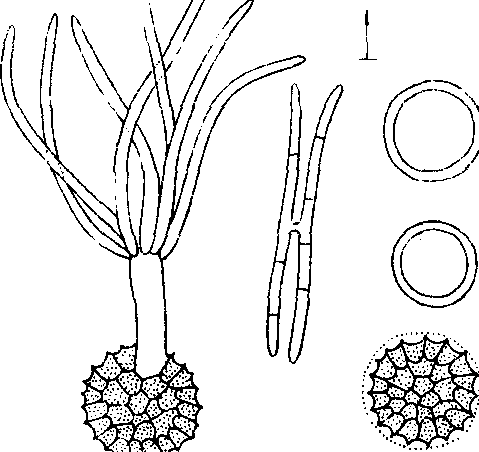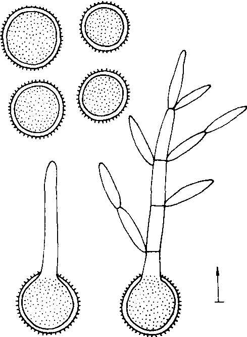 释义 | 黑粉菌目Ustilaginales寄生于植物形成大量黑色粉末状孢子的一类真菌。属担子菌亚门、黑粉菌纲。黑粉菌目是真菌的重要类群。至1983年已知约50属、950余种。中国报道18属,140余种。都是高等植物的寄生菌,大多侵染寄主植物的花序包括子房、胚珠、花药、花瓣等,少数侵染叶、茎、果实、腋芽、假根及根部形成黑粉状孢子堆。黑粉菌主要寄生禾本科、莎草科、十字花科、毛茛科、百合科植物,以禾本科植物上寄生种类最多,约有14属,600余种。个别黑粉菌种寄生少数裸子植物及蕨类植物上。黑粉菌的多数种广泛分布于世界各地,如裸黑粉菌、玉蜀黍黑粉菌、丝轴黑粉菌、小麦网腥黑粉菌和光腥黑粉菌等。有些种只限于少数地区发生,黑粉菌最早引起人类的注意是因其寄生于禾谷类作物上,常导致粮食减产带来经济损失。菰(Zizania caduciflora)地下茎因受菰黑粉菌侵染形成的茭白嫩茎可食用。 图1 玉蜀黍黑粉菌 轴黑粉菌属(Sporisorium Ehrenb,ex Link=Sphacelo the cade Bary) 冬孢子堆生于寄主植物各部位,以花序和子房中最常见,团粒或粉末状,外有菌丝组成的被膜包围,成熟后被膜破裂形成一串不育细胞,多为圆形、卵圆形或圆柱形,无色或淡色,孢子堆中有寄主组织组成的中轴; 冬孢子散生,单胞,其萌发方式与黑粉菌属相同。本属也是引起植物黑穗病的重要病原菌,多寄生禾本科、蓼科和莎草科植物上。已描述130余种,中国报道24种和1个变种。常见种有引起高粱坚黑穗病的高粱坚轴黑粉菌(S.sorghiEhrenb.ex Link),引起高粱散黑穗病的高粱轴黑粉菌〔S. cruentum (Kuehn) Vanky〕,引起高粱、玉米丝黑穗病的丝轴黑粉菌〔S. reilianum (Kuehn) Lang-don et Full.〕和引起甘蔗黑穗病的甘蔗轴黑粉菌〔S.sacchari (Rebenh.) Vanky〕。 团黑粉菌属(Sorosporium Rudolphi) 冬孢子堆生于寄主植物各部位,多寄生于花器,破坏整个花序,外有被膜包围,成熟后膜破裂,冬孢子堆褐色至黑色; 冬孢子集结成圆形或卵圆形的孢子球,完全成熟后极易分散,无不育细胞,其萌发方式与黑粉菌属相同。本属寄生于禾本科、莎草科、石竹科等植物上。已描述110余种,中国报道11种。常见种有引起高粱长粒黑穗病的埃伦团黑粉菌(S.ehrenbergii Kuehn)。 褶孢黑粉菌属 (Tolyposporium Woronin exSchroter) 冬孢子堆生于寄主花器中,主要破坏子房形成颗粒状或半带胶性由多数孢子结合而成的孢子球,孢子壁隆起部分互相嵌合胶结,紧密结合成永久性孢子球,孢子不分离; 冬孢子萌发方式与黑粉菌属相同。本属寄生于禾本科、莎草科、灯心草科、马齿苋科植物上。已描述30种,中国报道3种。常见种有引起稗粒黑穗病的泡状褶孢黑粉菌 〔T.bullatum(Schrot.) Schrot.〕。 腥黑粉菌属(Tilletia Tul. et C. Tul) 冬孢子堆多生于寄主子房,少数种寄生其它部位,粉状或带胶性,常有恶腥气味; 冬孢子单生,周围有无色或带色的胶质鞘,表面具网状、刺疣状花纹,少数为光滑的。膜的一边偶有不明显的突起呈尾状,较冬孢子直径短。孢子堆中常有许多外形似不育细胞未成熟的孢子;冬孢子萌发产生无隔担子,顶端簇生担孢子(图2)。是黑粉菌目重要的属,有许多重要植物病原菌,多寄生于禾本科、蓼科、大戟科等植物。已描述90种,中国报道13种。常见种有引起小麦腥黑穗病的小麦网腥黑粉菌〔T.caries(DC.) Tul.〕和小麦光腥黑粉菌〔T.foetida (Wallr.)Liro〕,以及引起小麦矮腥黑穗病的小麦矮腥黑粉菌(T.contraversa Kuehn)。 图2 小麦网腥和光腥黑粉菌 尾孢黑粉菌属(Neovossia Koern) 冬孢子堆生于寄主子房,半胶结至粉末状。冬孢子单生于产孢菌丝的末端细胞,产孢菌丝在孢子形成后残留在孢子外围,并形成一柄状附属物; 冬孢子表面布满齿状突起,突起基部呈三角形;冬孢子萌发方式与腥黑粉菌属相同(图3)。本属为世界性分布种。寄生禾本科植物。已描述5种,中国报道1种。芦苇腥黑穗病是由艾瓦尾孢黑粉菌(N.iowensis Hume et Hods)引起。 图3 艾瓦尾孢黑粉菌 叶黑粉菌属(Entyloma de Bary) 冬孢子堆常生于叶、叶柄、茎组织,偶有生在花序的各部组织,永久埋生,形成圆形、椭圆形、多角形等褪色斑点。冬孢子单生,圆形,无色或稍带色,很少深色,中等大小; 常两个或多数集结成组,有时在孢子组外面生有一层胶质鞘; 冬孢子萌发方式与腥黑粉菌属相同。本属为世界性分布种。已描述100余种,中国报道7种。常见种有引起水稻叶黑粉病的稻叶黑粉菌(E.oryzaeSyd.)。 条黑粉菌属(Urocystis Rabenh.) 冬孢子堆生于寄主的各部位,以叶、叶鞘和茎上为多,黑褐色至黑色,粉末状或颗粒状;孢子球由一至数个冬孢子组成,结合坚固,不分离,中间是多个褐色、近球形的冬孢子,外围是多个无色或浅色较小的不育细胞组成的皮膜;冬孢子萌发方式与腥黑粉菌属相同(图4)。本属为世界分布种。寄生于23科83属植物。已描述100余种,中国报道13种。常见种有引起小麦秆黑粉病的小麦条黑粉菌(U.tritici Koern)和引起元葱叶黑粉病的元葱条黑粉菌(U.cepulae Frost.)。 图4 小麦条黑粉菌 实球黑粉菌属(Doassansia Cornu) 冬孢子堆生于寄主的各部位,以叶肉组织为最常见,长期埋生于寄主组织,偶有生于子房; 由多数冬孢子集结成大型的孢子球,坚实,孢子球外围有一层不育细胞,里面是冬孢子; 冬孢子淡黄褐色或无色,壁薄,球形至多角形,其萌发方式与腥黑粉菌属相同。本属为世界性分布,多寄生于水生植物上。已描述20余种,中国报道1种,即引起慈姑黑粉病的暗淡实球黑粉