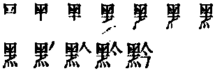 ❸ 布衣黔首 黔 金文; 篆qián[黑(意符)+今(聲符)→黔(《説文》:“黔,黎也。從黑今聲。秦謂民爲黔首,謂黑色也。周謂之黎民。《易》曰:‘爲黔喙。’”黔:黑色〈黔首〉;貴州省的别稱。)] [西漢] 司馬遷 《史記·秦始皇本紀》:“上農除末,黔首是富。”(重視農業,抑制奸商,百姓富裕安康。) 黔* qián(16画)