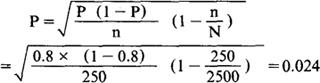 释义 | 区间估计 抽样估计的主要方法。 它根据抽样估计要求的可靠程度,从概率表查概率度t,用t值乘以平均误差得极限误差,结合调查的样本指标定出估计上限和下限。下限至上限的范围称置信区间。 全及指标落入置信区间的概率称置信度。以样本平均数估计全及平均数时,估计下限为 以样本成数估计全及成数时,估计下限为P-tσp,估计上限为P+tσp。例如,某地区有乳牛2500头,用简单随机不重复抽样抽出250头进行调查,算得每头乳牛年平均挤奶量为3000公斤,挤奶量的标准差为300公斤,样本中良种乳牛比重是0.8,要求以95%的可靠程度估计全及总体每头平均挤奶量和良种乳牛比重。 则: P=0.8 t=1.96 估计平均挤奶量、平均误差。 估计下限为 估计上限为 即:平均每头挤奶量在2964.7~3035.3公斤之间,估计的可靠程度为95%。 估计良种乳牛比重、平均误差。 估计下限P-tσp=0.8-1.96×0.024=0.753 估计上限P+tσp=0.8+1.96×0.024=0.847 即全及总体中,良种乳牛比重在0.753~0.847之间,估计的可靠程度为95%。 小样本(样本容量n<30)的区间估计方法与大样本基本相同,区别在于依自由度和可靠程度从t分布表查t值,计算平均误差所用的方差或标准差,用自由度(n-1)计算。 |