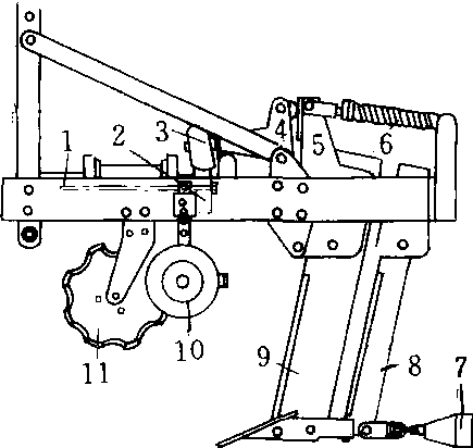 释义 | 鼠道犁mole draining plow又称塑孔犁或暗沟犁。一种在地下开排水暗沟的农具。由锥形犁头,塑孔器及刀形犁柱等组成。可由拖拉机或动力绞盘牵引作业。暗沟直径约为90~100mm,深度可达0.8 m。暗沟排水的特点是土地利用率高,维修管理工作量小,便于农业机械的田间作业,并能有效地降低地下水位。 振动暗沟犁示意图 1.输入轴 2. 振动凸轮 3. 从动滚轮 4. 振动架 5. 振动刀刃安装附件 6.压缩弹簧 7. 塑孔器 8. 固定刀刃 9. 振动刀刃 10. 限深轮 11. 圆盘锯齿刀刃 |
