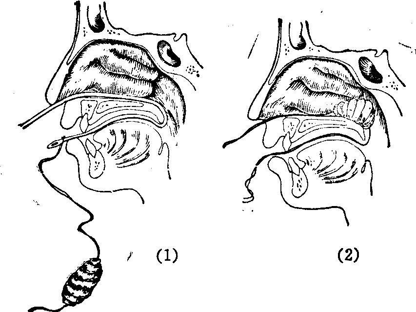 烧灼法: 用药物或电热烧灼出血点。常用药物有铬酸、硝酸银和三氯醋酸等。用铬酸或硝酸银结晶烧灼的方法为先行鼻粘膜表面麻醉,并以肾上腺素棉片压迫于出血处,用稍加热的探针粘取铬酸或硝酸银结晶颗粒,于酒精灯上缓缓加热,使逐渐溶化而垂于探针的尖端,稍冷凝成铬酸或硝酸银珠,取出压迫止血的棉片,立即将该珠轻点于出血处即可止血。亦可用30~50%硝酸银溶液或50%三氯醋酸溶液烧灼患处。 冷冻法: 低温冷冻对鼻腔前部出血较为适宜(见“冷冻疗法在耳鼻咽喉科的应用”)。 局部止血药: 种类很多,除肾上腺素、凝血质等可用作局部止血外,中草药中如白芨、紫珠草、海螵蛸、三七及马勃等局部应用也可止血。 填塞法: 于出血量较多、出血部位不明确或用上述方法无效时采用。 (1) 前鼻孔填塞法: 以灭菌凡士林纱条先压于鼻腔底部,然后绕至中鼻甲前上方,再由上而下反复重迭填塞于鼻腔保持一定压力,24~48小时后取出,如仍有出血可再行填塞。亦可用抗生素油膏碘仿纱条填塞,则可留置较长时间。 (2) 后鼻孔填塞法: 用导尿管由鼻腔插入咽部,从口腔引出其远端,其尾端仍留于前鼻孔外。将预制锥形或枕形纱球上的双线缚于导尿管头端,然后抽拉导尿管之尾端,纱球随之经口腔进入鼻咽部,最后堵塞于后鼻孔。纱球上的双线引出鼻外,结扎固定于放置前鼻孔的纱布卷上。纱球另一端所系的短线,留于口内,以便以后取出纱球之用。后鼻孔填塞留置时间不宜过久,一般在24~48小时内取出,必要时再行填塞。