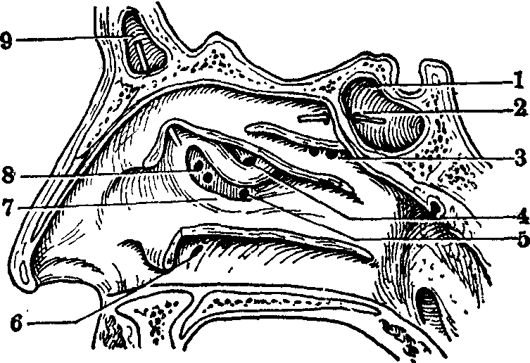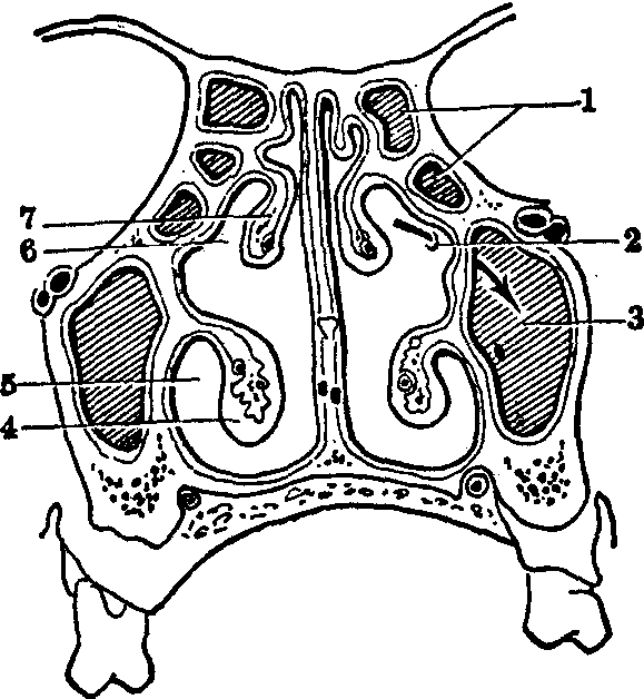 释义 | 鼻旁窦paranasal sinuses位于鼻腔周围各骨内的空腔叫鼻旁窦,亦叫副鼻窦,即额骨内的额窦、筛骨内的筛窦、蝶骨内的蝶窦、上颌骨内的上颌窦。这些鼻旁窦与鼻腔相通。蝶窦开口于上鼻甲的后上方,后筛窦开口于上鼻道,前筛窦、额窦及上颌窦均开口于中鼻道。鼻旁窦由于充气且与外界借管道相通,因此有调节、缓冲气压的功能,但易发生炎症与肿瘤。 鼻旁窦paranasal sinus亦称副鼻窦。包括额窦、上颌窦、筛窦和蝶窦。额窦位于眉弓深面额骨的两层骨板之间,开口于中鼻道。上颌窦位于上颌骨体内,容积为13~14ml,前壁中央部即对尖牙窝处骨质最簿,开口于中鼻道半月裂孔后部。筛窦位于鼻腔外侧壁上份与眶内侧壁之间,可分三群,前、中群开口于中鼻道,后群开口于上鼻道。蝶窦位于蝶骨体,开口于蝶筛隐窝。 鼻旁窦 鼻旁窦鼻旁窦(副鼻窦)是指与鼻腔相通的,位于额骨、筛骨、蝶骨及上颌骨内衬有粘膜的腔洞。鼻旁窦的名称和它所在的骨名一致。它们都是左右成对,但多不对称。一般认为其主要功能为湿润和温暖吸入的空气、对发音起共鸣作用,吸收对头部的震荡,保护感觉器官,同时也减轻头骨的重量。窦内面覆以粘膜,与鼻腔者相续连,但粘膜内因腺体及血管较少,因此较薄且与骨附着疏松易于剥离。上皮的纤毛向窦口摆动,气体迅速流经窦口时,窦内产生负压,有助于将窦内的内容物排出。鼻旁窦于生后才逐步发育,到青春期显著扩大,是人面型变化的因素之一,窦的形态和体积有个体差异。 鼻旁窦的毗邻及开口(冠状切面示意图) 鼻旁窦及其开口(矢状切面,鼻甲已切除) 血管、淋巴和神经:动脉由筛后动脉和上颌动脉咽支供给。静脉血通过筛后静脉注入眼上静脉。淋巴引流汇入咽后淋巴结。神经由筛后神经和翼腭神经节的眶支支配。 ☚ 鼻 喉 ☛ 鼻旁窦 鼻旁窦鼻旁窦又称副鼻窦或鼻窦,为某些颅骨内的腔,有孔通连鼻腔。鼻旁窦共有四对,即上颌窦、额窦、筛窦和蝶窦。窦壁衬贴粘膜,与鼻腔粘膜相连续。粘膜构造与鼻腔呼吸部的相似,被覆假复层纤毛柱状上皮,但杯形细胞少。正常时,纤毛摆动,将窦中的分泌物排向鼻腔。固有层较薄,与骨膜结合,二者无明显界限,其中主要含胶原纤维和结缔组织细胞,腺较小且少,为混合性腺。鼻旁窦可湿润和温暖气体,并对发音起共鸣作用。由于鼻旁窦与鼻腔通连,故鼻腔发炎时可波及鼻旁窦。 ☚ 鼻 喉 ☛ 鼻旁窦 鼻旁窦sinus paranasales又称“副鼻窦”。开口于鼻腔含有空气的骨性腔洞。分为上颌窦、额窦、蝶窦和筛窦四对。窦内衬有黏膜,与鼻腔黏膜相延续。鼻腔发炎时可延至鼻旁窦。鼻旁窦可湿润和温暖吸入气体,对发音起共鸣作用。 ☚ 鼻前庭 副鼻窦 ☛ 鼻旁窦paranasal sinus |