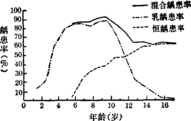 释义 | 龋齿预防 龋齿预防龋齿是牙齿经常受到口腔内酸的侵袭,使牙釉质受到腐蚀,变软变色,逐渐发展为实质缺损而形成龋洞。龋洞不会自愈,如不予修补会继续腐蚀到牙本质、牙髓,只留下残根。龋齿不仅使儿童感到疼痛而影响食欲、咀嚼、消化、吸收和生长发育,有时会导致牙髓炎、齿槽脓肿,甚至引起全身疾病,影响健康。 图1 龋患率与年龄的关系(据北京医学院三院口腔科等,1973) 龋均及患者龋均 计算龋均是将受检儿童的龋齿数除以受检儿童人数,据此可了解学龄儿童中龋齿的平均数,以说明其严重情况。计算患者龋均是将受检儿童的龋齿数除以有龋齿的儿童数,据此可估计需要治疗者的龋齿数目,以便估计及安排治疗日程及人力、物力等。从龋均与年龄关系(图2)可以看出,乳龋均和患者乳龋均都是在幼儿园和小学最高,中学最低。恒龋均和患者恒龋均则是中学最高,小学次之,幼儿园最低。 图2 龋均与年龄的关系 无论从龋患率或龋均来看,乳龋都明显高于恒龋,说明托幼年龄儿童龋病的发展既多又快,应该是预防的重点对象,一定要使他们养成保护牙齿的卫生习惯。 龋、失、补分析 通过龋、失、补的统计分析可以反映该地区对中、小学及幼儿园儿童龋齿治疗情况。方法是将检查出来的龋齿分为三类: ❶“龋”是指未经补过的活动龋; ❷“失”是因龋病而失去的齿; ❸“补”是补好了的龋。在我国儿童中,活动恒龋的比重很高,占龋总数的90.3% (见表)。大量的恒龋未经过治疗,在幼儿园未经补过的恒龋竟高达100%,有些父母不了解六龄齿是恒齿,认为早晚要换而不修补,反映目前龋齿的防治工作还远远跟不上儿童口腔保健的需要。 恒牙的龋、失、补分析表