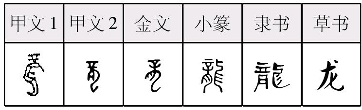【析形】象形字。甲骨文字形像一种兽首蛇身,头上有冠的怪兽。金文字形的形体,上部是角,角下是头,嘴巴朝左张开露出两颗锋利的牙齿,右边是弯弯曲曲的躯体。小篆字形变化,兽头与兽身部分割裂,隶、楷字形承之。 【释义】《说文》:“鳞虫之长。能幽能明,能细能巨,能短能长,春分而登天,秋分而潜渊。”本义是中国古代传说中的神异动物,具有虾眼、鹿角、牛嘴、狗鼻、鲶须、狮鬃、蛇尾、鱼鳞、鹰爪等九种动物合而为一之形象。龙的身体长,有鳞,有角,有脚,能走,能飞,能游泳,能兴云降雨。 华夏民族的先祖炎帝、黄帝,传说和龙都有密切的关系,相传炎帝为其母感应“神龙首”而生,死后化为赤龙。因而中国人自称为“龙的传人”。龙在中国传统文化的十二生肖中排列第五。封建时代龙作为帝王的象征,也用来指帝王及其相关的东西,如龙颜、龙体、龙廷、龙袍。龙是中国人吉祥的象征,如[龙凤呈祥]、[龙马精神]等成语均与吉庆有关。龙是华夏民族的代表,与西方文化中的dragon并非一事。 【shape analysis】It is the pictograph character.In Oracle,it is shaped like a monster with a snake body and a crowned beast head.While in Bronze Inscriptions,the upper part of the character is a horn,but the lower is a head with the mouth open to the left,with two sharp teeth exposed.The right part of the character is the twisted body of monster.The monster's head was separated from its body in Small Seal script.This shape was followed in Official script and Regular script. 【original meaning】A kind of deified animal in ancient Chinese legend,which has shrimp's eyes,deer's antlers,cattle's mouth,dog's nose,catfish's whisker,lion's mane,snake's tail,fish scales and hawk's claws.龙(It is called dragon in western world)has a long body with scales,antlers and feet.It can walk,fly as well as swim and make it rains.龙is a symbol of the Chinese nation,different from the traditional dragon in western world.