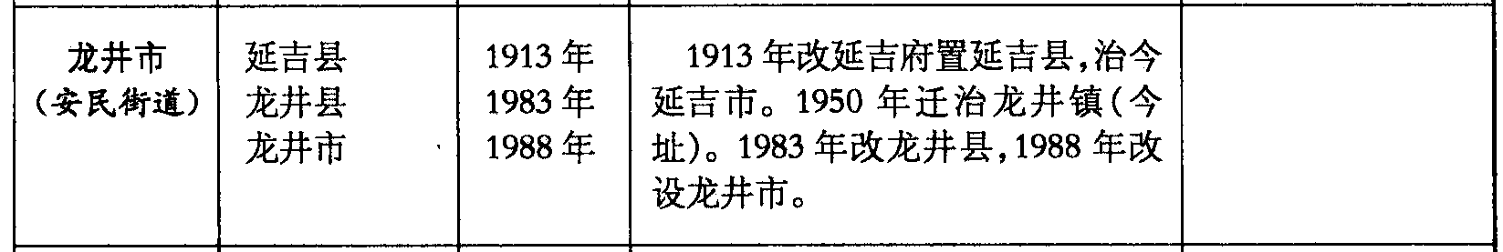 龙井市(安民街道)延吉县龙井县龙井市1913年1983年1988年1913年改延吉府置延吉县,治今延吉市。1950年迁治龙井镇(今址)。1983年改龙井县,1988年改设龙井市。