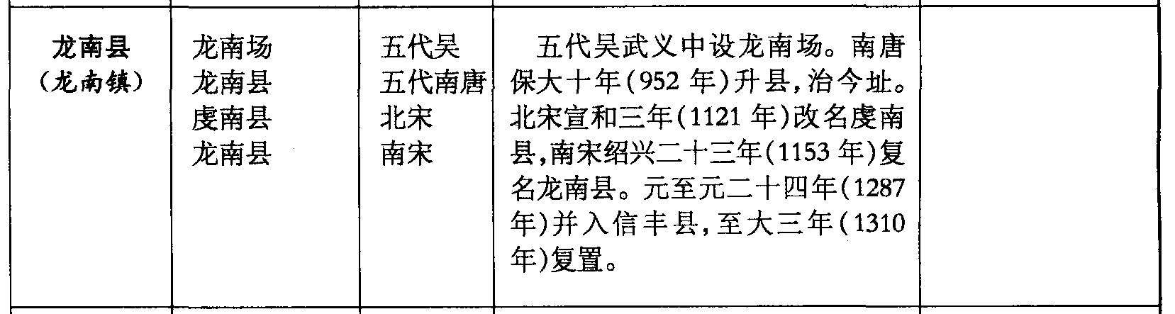 龙南县(龙南镇)龙南场龙南县虔南县龙南县五代吴五代南唐北宋南宋五代吴武义中设龙南场。南唐保大十年(952年)升县,治今址。北宋宣和三年(1121年)改名虔南县,南宋绍兴二十三年(1153年)复名龙南县。元至元二十四年(1287年)并入信丰县,至大三年(1310年)复置。
