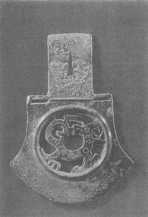 商。通长17厘米,圆穿径9厘米。1964年陕西省城固五廊庙出土。陕西省城固文化馆藏。钺,古代兵器。盛行于商、周,多为礼仪所用。此钺内长方形,中有三角形穿。本有二长穿。援透雕为龙形,作行走状。刃边呈圆形,两角向外侈。此器设计巧妙,制作精工,其风格特殊,尤内穿作狭三角形,与巴蜀兵器有一定关系。为商代青铜器中的一件艺术珍品。
