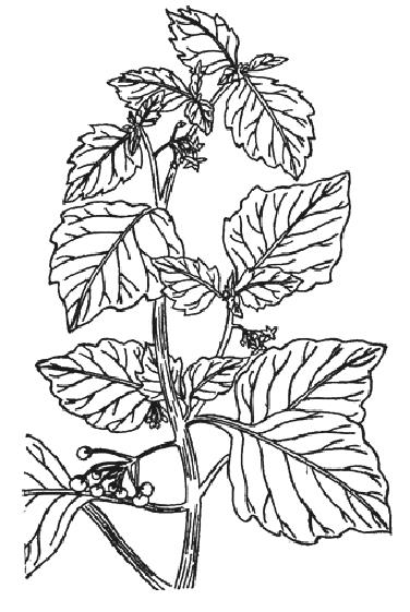 龙葵一1181名苦菜(古代通称)。药用草本植物。古北方方言。北齐颜之推《颜氏家训・书证》:「苦菜,叶似酸浆,其花或紫或白,子大如珠,熟时或赤或黑。此菜可以释劳…今河北谓之~。」   古代名物 > 醫藥類(下) > 蔬實部 > 菜 > 龍葵 龍葵 lóngkuí 亦稱“救兒草”、“後紅子”、“天泡果”。茄科植物龍葵的全草。其性滑如葵,故稱。一年生草本,高二尺,莖直立,有稜角。葉互生,卵形,先端尖或長尖。主治疔瘡,癰腫,跌打扭傷。清·蘭茂《滇南本草圖説·龍葵》:“異名:救兒草,後紅子。”清·吳其濬《植物名實圖考·隰草類·龍葵》:“亦曰天泡果。” 龙葵药名。出《药性论》。又名苦葵、天泡草、天茄子、山海椒、乌疔草、野辣椒。为茄科植物龙葵Solanum nigrum L.的全草。我国各地均有分布。苦、微甘,寒,有小毒。清热解毒,散结消肿,利尿,抗癌。 ❶治痈肿疔疮,丹毒,天疱疮,跌打损伤,蛇咬伤,捣烂外敷;皮肤湿疹,瘙痒,煎服或煎水洗。 ❷治高血压病,咽喉肿痛,慢性气管炎,泌尿系感染,痢疾,水肿,白带;近用于治疗各种癌症。煎服:15~30g。过量服用可引起头痛、腹痛吐泻、瞳孔散大、精神错乱等中毒反应;长期服用,并可导致白细胞下降。本品含澳洲茄碱和澳洲茄边碱等多种生物碱苷,又含皂苷;苷元是薯蓣皂苷元和替告皂苷元,还含较多量的维生素类物质。龙葵碱能抑制豚鼠的过敏反应、升高正常大鼠血糖水平、降低糖耐量;静注时可降低动物血压,有镇静、溶血作用,并有某些抗癌活性。动物试验中有抗激素作用,可影响泌乳功能,促使孕鼠流产,故妊娠时不宜使用。龙葵碱毒性较大,如发芽的马铃薯中,含量可超过0.02%,食后可刺激胃肠黏膜,大量(200mg)可致中毒。龙葵碱无蓄积性,煮煎后可减低毒性。 龙葵black nightshadeSolanum nigrum L.,又称天茄子、苦葵。茄科,茄属。一年生草本。常生于田野、坡地、路边等处。分布于中国各地及世界温带和热带地区。植物茎直立,多分枝。单叶、互生,叶卵形,先端渐尖,叶全缘或有不规则波状粗齿,叶基阔楔形,并下延成柄。短蝎尾状聚伞花序,腋外生;花白色;花萼杯状;花冠辐状;雄蕊着生于花管口;子房由2心皮构成2室,每室胚珠多数。浆果,成熟时呈黑色。常野生,但亦有栽培,用种子繁殖,春季播种,夏秋开花结果。入药能清热解毒、利水消肿,治感冒发热、牙痛、支气管炎等,并可制成龙葵石灰合剂,杀灭棉蚜虫。