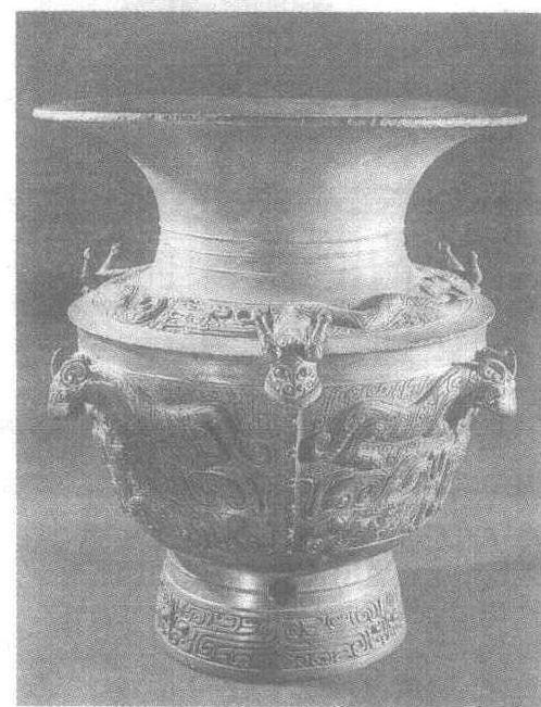 释义 | 古代名物 > 禮俗類(上) > 禮尚部 > 酒器 > 龍虎尊 龍虎尊 lónghǔzūn 商代中期青銅器。1957年於安徽阜南朱砦月芽河發現。重四十斤。大侈口,寬肩,圓腹,高圈足,有十字鏤孔,雕鏤勁利。肩部浮雕三條龍,作蜿蜒狀。腹部以三道突起之卷雲紋爲界,將腹分爲三部分。現藏中國歷史博物馆。 龙虎尊 龙虎尊这件青铜铸造的龙虎尊,高50.5厘米,口径45厘米,为商代后期遗物,1957年安徽省阜南县出土。 龙虎尊 商代青铜工艺雕塑继承了新石器时代雕塑传统,在造型、装饰、工艺上都有新的创造。商代后期,青铜工艺愈为重视器物整体造型和器面装饰,立体雕饰、浮雕、线刻等多种手法交互运用,出现了一批精美绝伦的作品。这件龙虎尊是代表器物之一。器物造型凝重、雄伟,侈口呈喇叭状外张,以高圈足做底,十分稳定。颈饰三道弦纹。圈足上部有三个十字纹镂孔,下以阴线刻兽面纹一周。器物主要装饰集中于肩部和腹部,十分醒目。三条浮雕游龙环肩部 逶迤而行,立雕龙首探出器外,卓有生气。龙首下三道扉棱将腹壁等分三个装饰面,每面均以高浮雕塑一双身虎,虎头高突,圆目大口,下踞 一人。此类巨虎食人题材,在商代青铜器中较为常见。 龙虎尊现藏于中国历史博物馆,为国宝级文物。 ☚ 人面纹青铜方鼎 象尊 ☛ 龙虎尊商代晚期青铜器。1957年出土于安徽阜南。其上饰精美的龙、虎、饕餮纹等。为同时期青铜器之精品。 |