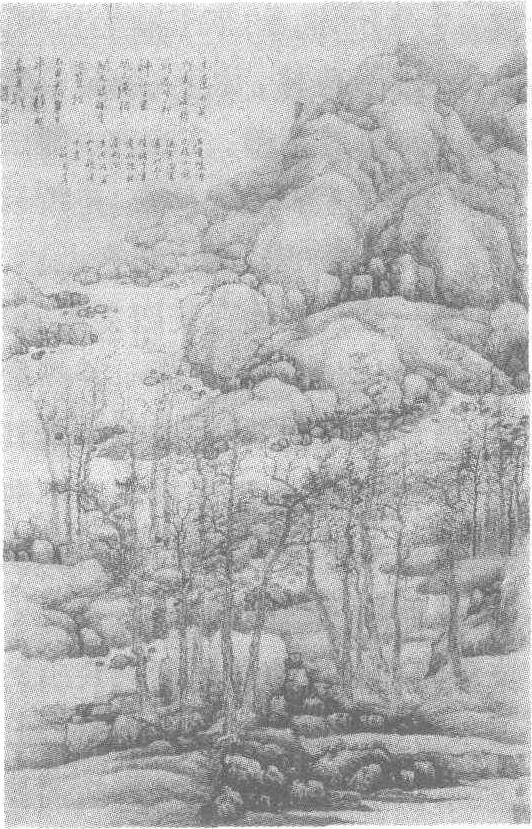 释义 | 龚贤木叶丹黄图轴 龚贤木叶丹黄图轴清。龚贤(见《龚贤夏山过雨图轴》条目)绘。纸本墨笔。纵99.7厘米,横65厘米。上海博物馆藏。作者在此件作品中一改苍茫浑郁的风格,用墨以简淡为主。画面上的山峦其势巍巍,雄伟高峻。低处的坡地崎岖坎坷,溪泉曲折于谷地,秋林枝桠曲劲,仅存稀疏的丹黄之叶。两间茅舍半掩于山石之后。作者以干墨层层皴点。墨色层次丰富,光线照射在山林间所形成的阴阳向背的效果,通过留白和皴擦给予得体的表现。近处树干的落笔雄健奔放,构图密而不乱,实中求虚。整个画面意境幽僻,秋意浓郁,令人感到清朗恬淡,并无凄凉哀婉的气氛,充分表现了作者热爱自然,融于自然,并以脱俗超世的心境去观察和表现景物季节变化的本愿。图左上方有自题七言诗一首。款署:“乙丑霜寒日,半亩龚贤画亦题。”乙丑为康熙二十四年(公元1685年)。此画堪称龚贤的杰出代表作。 ☚ 梅庚秋林书屋图轴 樊圻山涧奔流图扇页 ☛ |