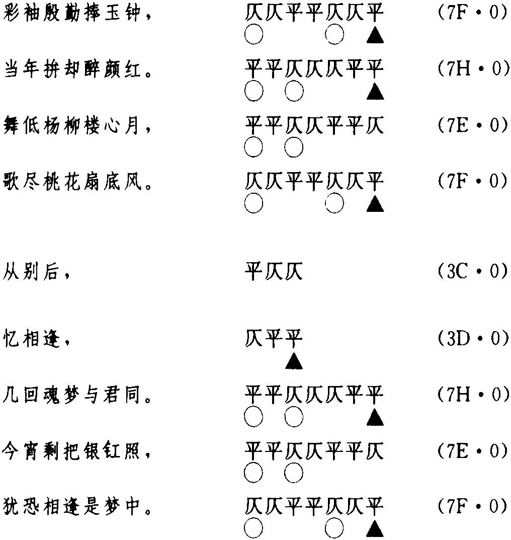释义 | (23)晏几道《鹧鸪天·彩袖殷勤捧玉钟》 (23)晏几道《鹧鸪天·彩袖殷勤捧玉钟》《鹧鸪天》又名《思佳客》、《千叶莲》、《思越人》、《洞中天》、《醉梅花》、《于中好》等。《鹧鸪天》一词系双调,55字,前片4句,后片5句,各3平韵;前片后二句、后片前二句,多对仗。 这首词,共押六个平声字韵,详况如下: 钟 读音zh·ong (-)。职容切,平,东韵。为ong韵目,属eng—ong—iong—ueng韵部。 红 读音h·ong (ˊ)。户公切,平,东韵。为ong韵目,属eng—ong—iong—ueng韵部。 风 读音f·eng (-)。方戎切,平,东韵。为eng韵目,属eng—ong—iong—ueng韵部。 逢 读音f·eng (ˊ)。符容切,平,钟韵。为eng韵目,属eng—ong—iong—ueng韵部。 同 读音t·ong (ˊ)。徒红切,平,东韵。为ong韵目,属eng—ong—iong—ueng韵部。 中 读音zh·ong (-)。陟弓切,平,东韵。为ong韵目,属eng—ong—iong—ueng韵部。 在今韵方面,以上六个韵字所押的韵是eng—ong—iong—ueng韵部(第420韵部)。 在古韵方面,押东韵(上平01)、钟韵(上平03)。东韵要求独用,与钟韵不相邻,也不通押。 ☚ (22)李清照《醉花阴·薄雾浓云愁永昼》 (24)李煜《虞美人·春花秋月何时了》 ☛ |