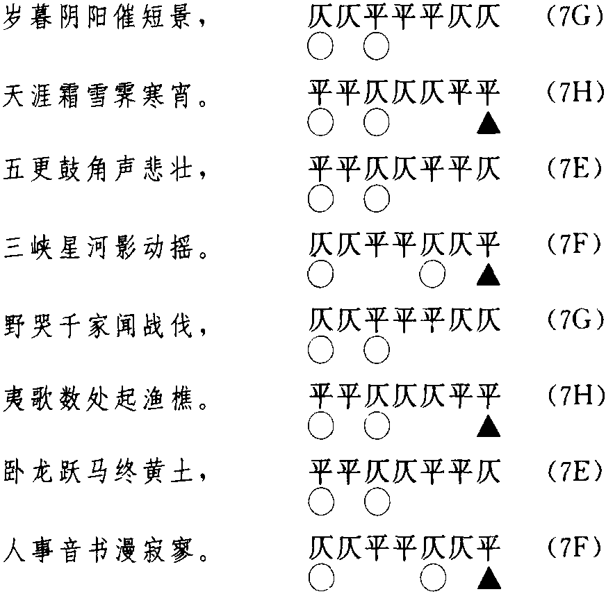 7G律句,是仄起仄收句。在七律中,以7G律句为首句的格式较为罕见。现以杜甫《阁夜》为例写出模式诗律如下: